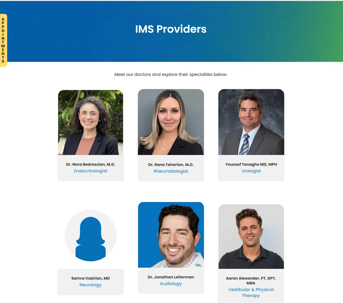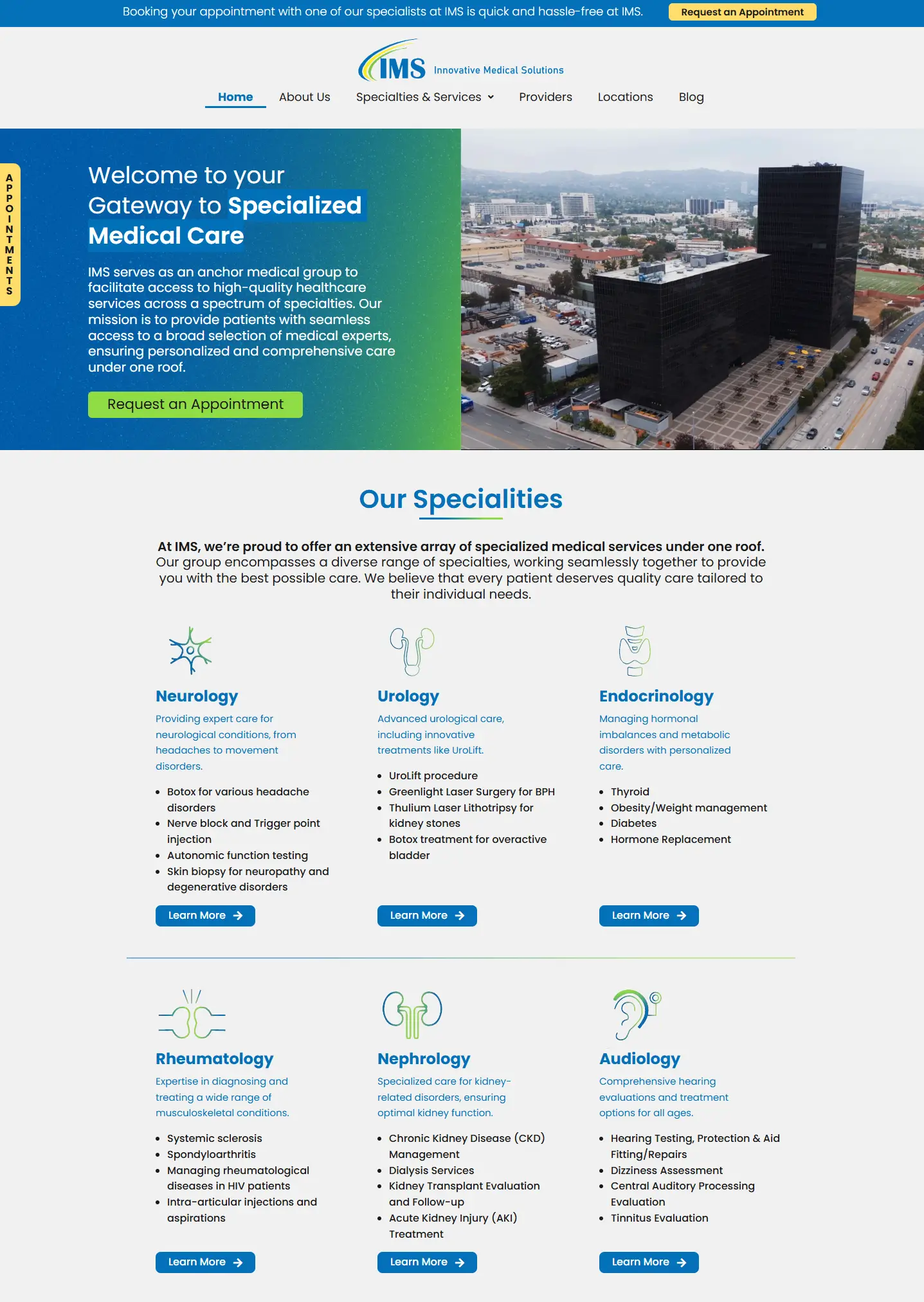 IMS Medical Group provides specialized outpatient care across multiple disciplines including Neurology, Urology, Endocrinology, Rheumatology, Nephrology, and Audiology. The website serves as an accessible platform for patients to explore services, find locations, and request appointments with ease. It’s built to support patients throughout their journey by offering clear navigation and in-depth service details.
